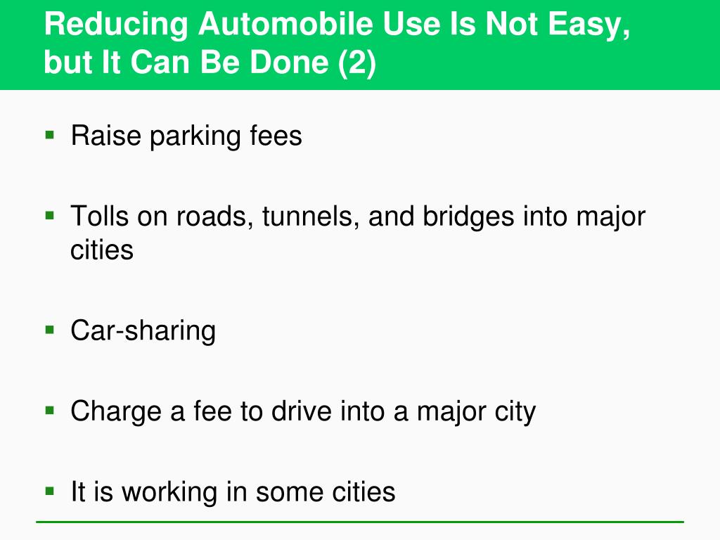 Reducing Automobile Use Is Not Easy, but It Can Be Done (2) • Raise parking fees • Tolls on roads, tunnels, and bridges into major cities • Car-sharing • Charge a fee to drive into a major city • It is working in some cities