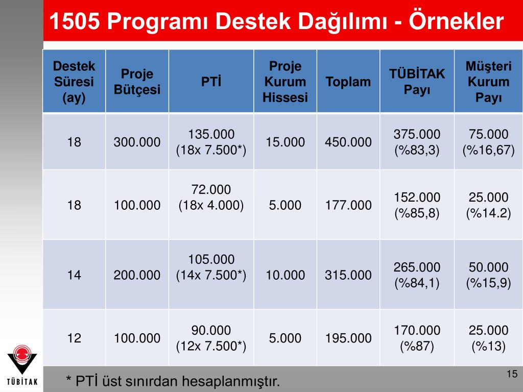 1505 Programı Destek Dağılımı - Örnekler * PTİ üst sınırdan hesaplanmıştır.