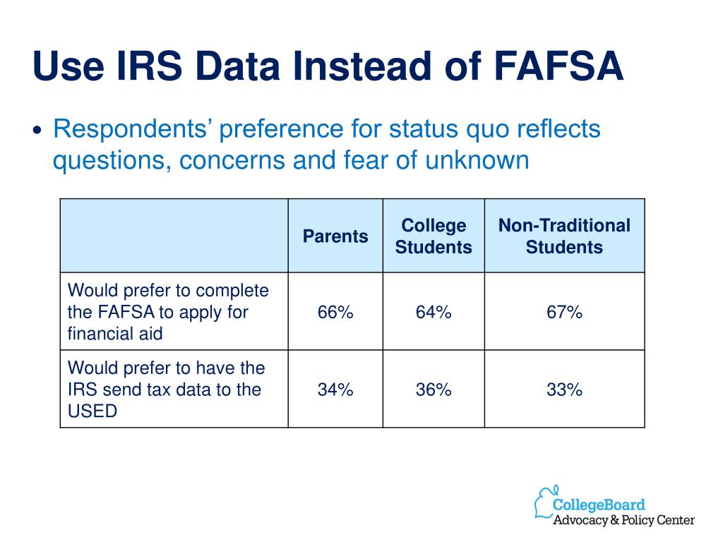 Use IRS Data Instead of FAFSA Respondents’ preference for status quo reflects questions, concerns and fear of unknown