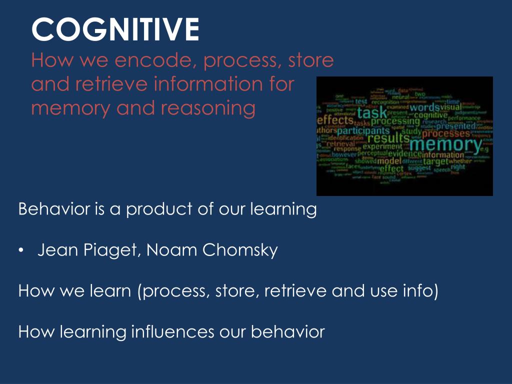 COGNITIVEHow we encode, process, store and retrieve information for memory and reasoning • Behavior is a product of our learning • Jean Piaget, Noam Chomsky • How we learn (process, store, retrieve and use info) • How learning influences our behavior