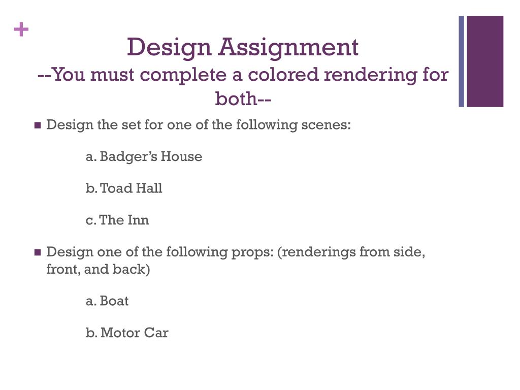 Design Assignment--You must complete a colored rendering for both-- • Design the set for one of the following scenes: a. Badger’s House b. Toad Hall c. The Inn • Design one of the following props: (renderings from side, front, and back) a. Boat b. Motor Car