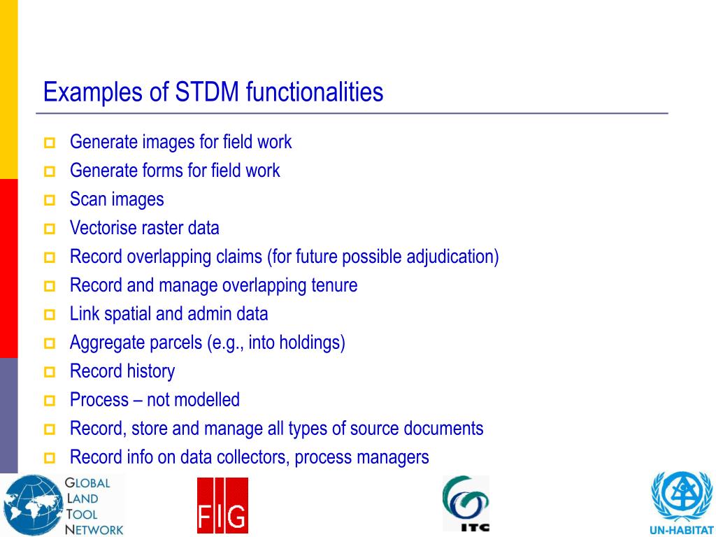 Examples of STDM functionalities • Generate images for field work • Generate forms for field work • Scan images • Vectorise raster data • Record overlapping claims (for future possible adjudication) • Record and manage overlapping tenure • Link spatial and admin data • Aggregate parcels (e.g., into holdings) • Record history • Process – not modelled • Record, store and manage all types of source documents • Record info on data collectors, process managers