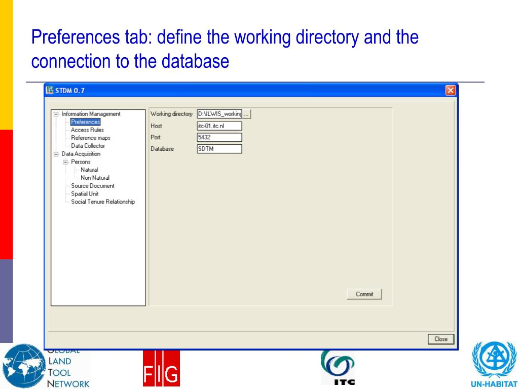 STDM: Navigation pane • Information Management section: define parameters to connect to the selected database, to define access rules, the working directory, Reference maps and data collectors. • Data Acquisition section:Input data in the database