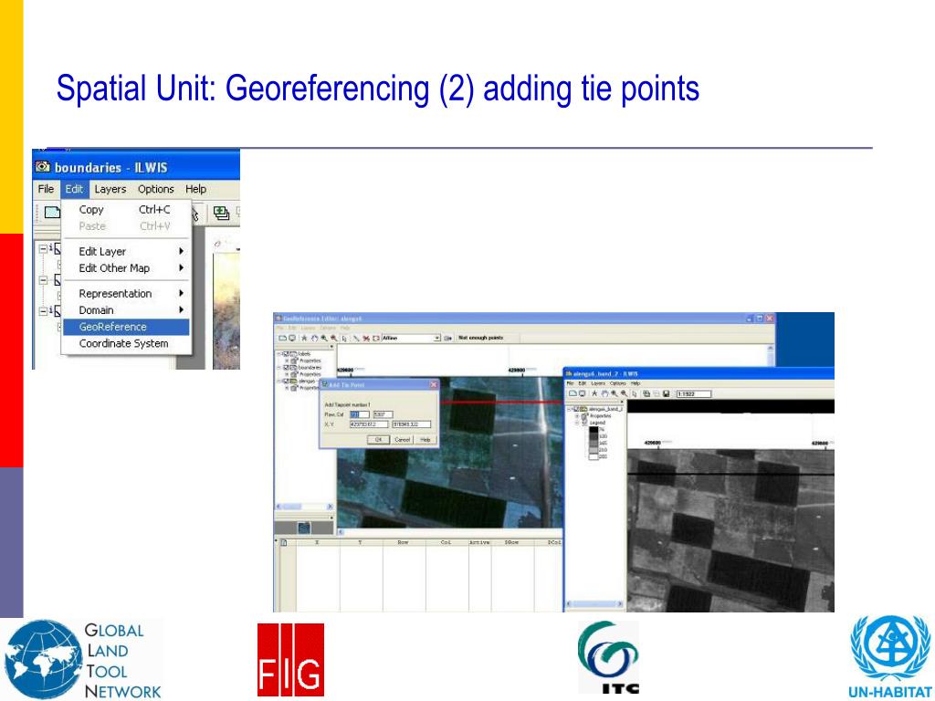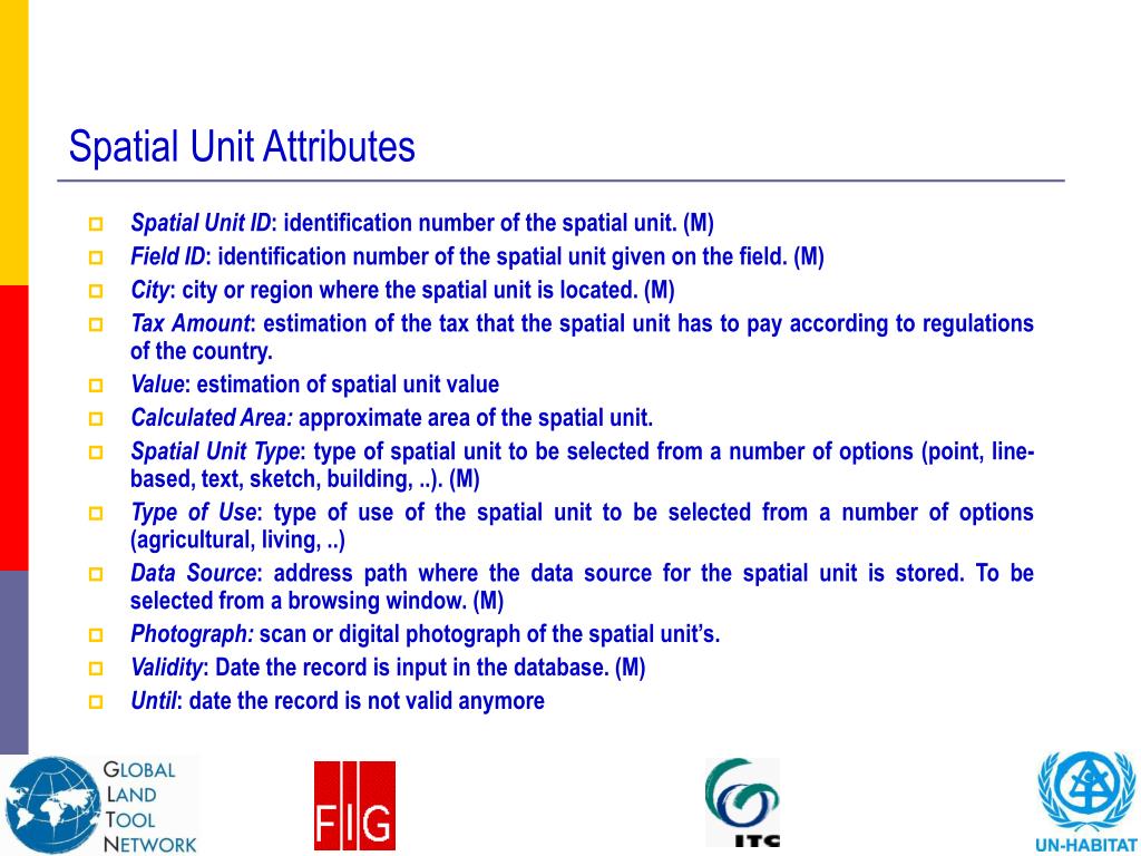 Spatial Unit Attributes • Spatial Unit ID: identification number of the spatial unit. (M) • Field ID: identification number of the spatial unit given on the field. (M) • City: city or region where the spatial unit is located. (M) • Tax Amount: estimation of the tax that the spatial unit has to pay according to regulations of the country. • Value: estimation of spatial unit value • Calculated Area: approximate area of the spatial unit. • Spatial Unit Type: type of spatial unit to be selected from a number of options (point, line-based, text, sketch, building, ..). (M) • Type of Use: type of use of the spatial unit to be selected from a number of options (agricultural, living, ..) • Data Source: address path where the data source for the spatial unit is stored. To be selected from a browsing window. (M) • Photograph: scan or digital photograph of the spatial unit’s. • Validity: Date the record is input in the database. (M) • Until: date the record is not valid anymore