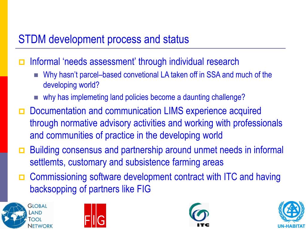 STDM development process and status • Informal ‘needs assessment’ through individual research • Why hasn’t parcel–based convetional LA taken off in SSA and much of the developing world? • why has implemeting land policies become a daunting challenge? • Documentation and communication LIMS experience acquired through normative advisory activities and working with professionals and communities of practice in the developing world • Building consensus and partnership around unmet needs in informal settlemts, customary and subsistence farming areas • Commissioning software development contract with ITC and having backsopping of partners like FIG