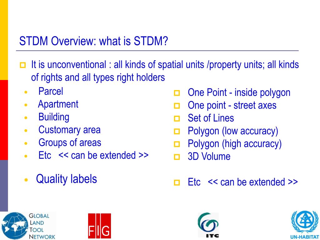 STDM Overview: what is STDM? • It is unconventional : all kinds of spatial units /property units; all kinds of rights and all types right holders • Parcel • Apartment • Building • Customary area • Groups of areas • Etc << can be extended >> • Quality labels • One Point - inside polygon • One point - street axes • Set of Lines • Polygon (low accuracy) • Polygon (high accuracy) • 3D Volume • Etc << can be extended >>