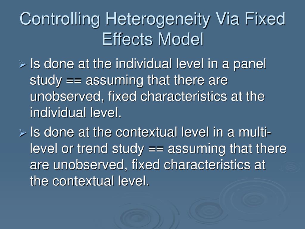 Controlling Heterogeneity Via Fixed Effects Model • Is done at the individual level in a panel study == assuming that there are unobserved, fixed characteristics at the individual level. • Is done at the contextual level in a multi-level or trend study == assuming that there are unobserved, fixed characteristics at the contextual level.