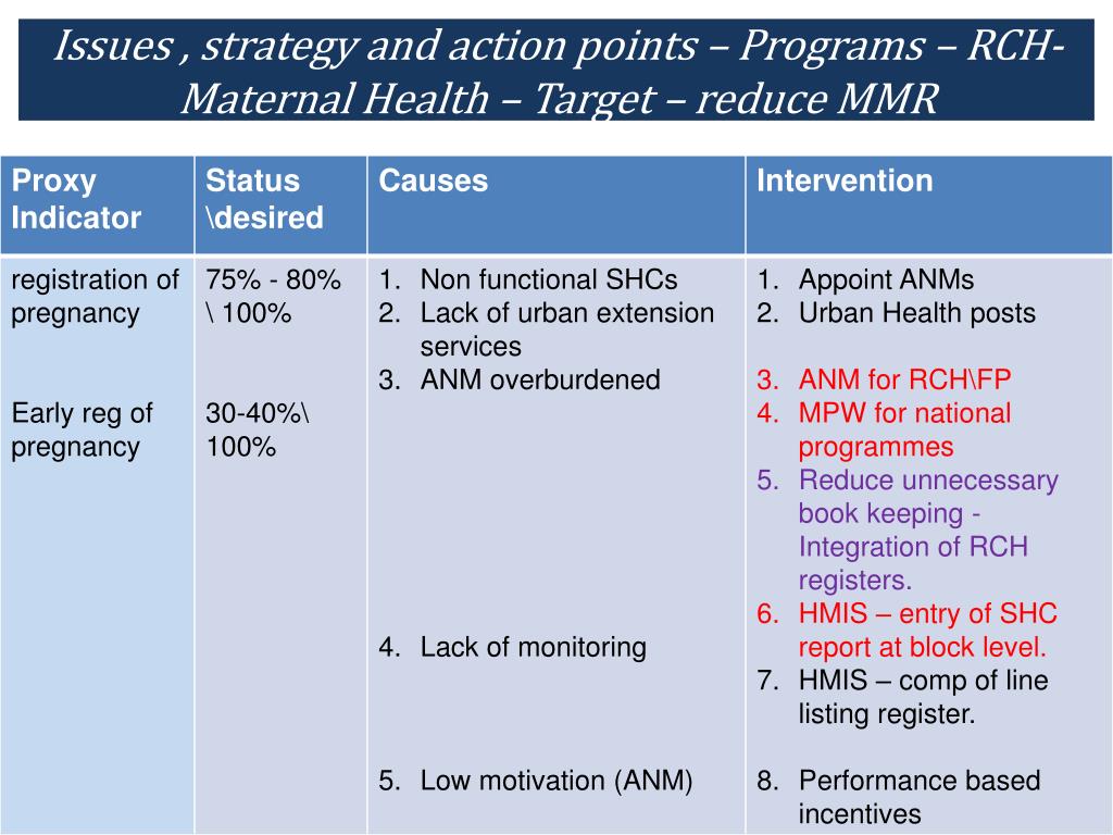 Issues , strategy and action points – Programs – RCH- Maternal Health – Target – reduce MMR