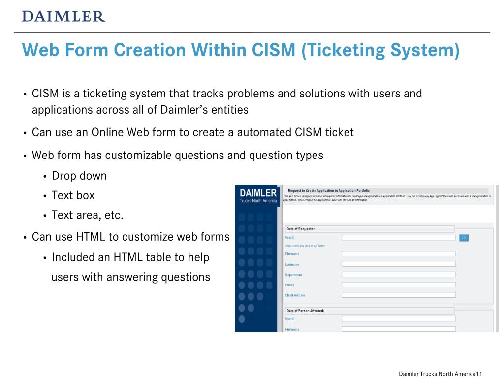 Web Form Creation Within CISM (Ticketing System) • CISM is a ticketing system that tracks problems and solutions with users and applications across all of Daimler’s entities • Can use an Online Web form to create a automated CISM ticket • Web form has customizable questions and question types • Drop down • Text box • Text area, etc. • Can use HTML to customize web forms • Included an HTML table to help users with answering questions