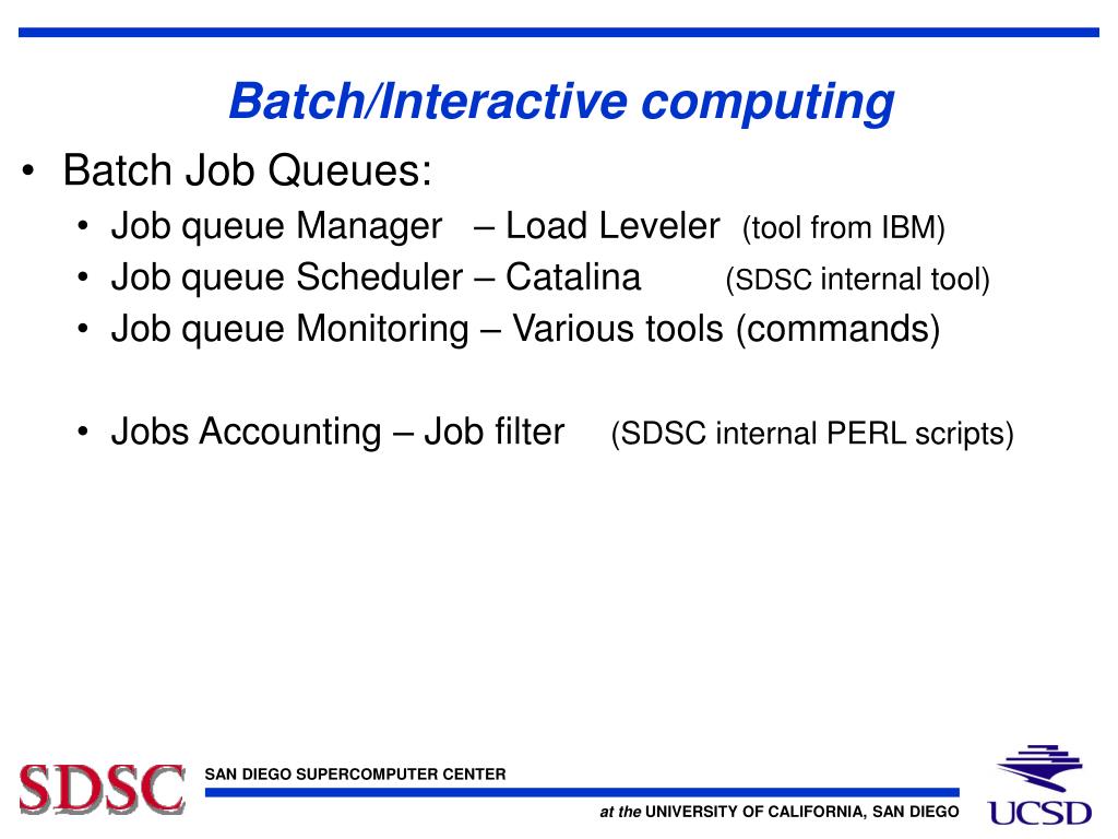 Batch/Interactive computing • Batch Job Queues: • Job queue Manager – Load Leveler (tool from IBM) • Job queue Scheduler – Catalina (SDSC internal tool) • Job queue Monitoring – Various tools (commands) • Jobs Accounting – Job filter (SDSC internal PERL scripts)
