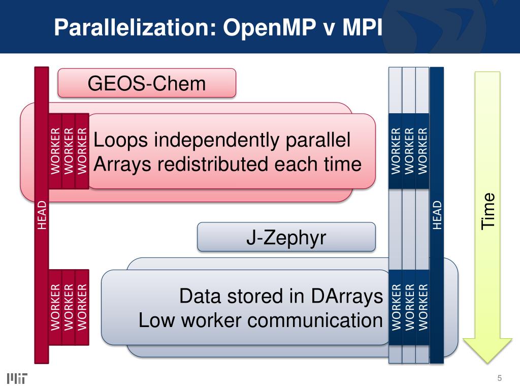 Parallelization: OpenMP v MPI HEAD HEAD GEOS-Chem Time WORKER WORKER WORKER Loops independently parallel Arrays redistributed each time WORKER WORKER WORKER J-Zephyr WORKER WORKER WORKER Data stored in DArrays Low worker communication WORKER WORKER WORKER