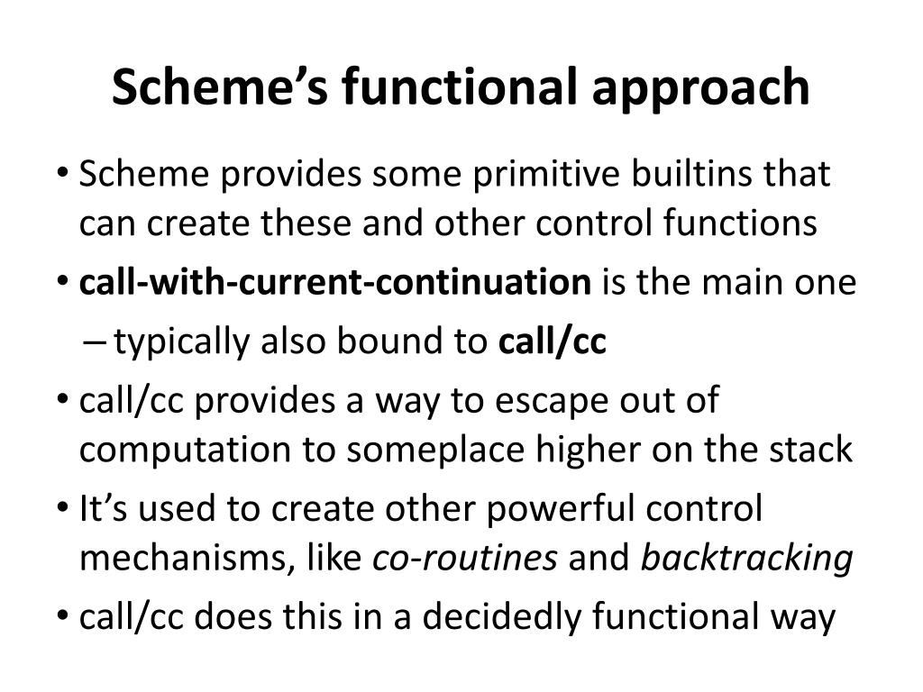 Scheme’s functional approach • Scheme provides some primitive builtins that can create these and other control functions • call-with-current-continuation is the main one • typically also bound to call/cc • call/cc provides a way to escape out of computation to someplace higher on the stack • It’s used to create other powerful control mechanisms, like co-routines and backtracking • call/cc does this in a decidedly functional way