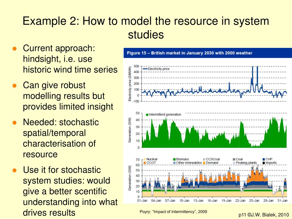 Example 2: How to model the resource in system studies • Current approach: hindsight, i.e. use historic wind time series • Can give robust modelling results but provides limited insight • Needed: stochastic spatial/temporal characterisation of resource • Use it for stochastic system studies: would give a better scentific understanding into what drives results Poyry: “Impact of Intermittency”, 2009