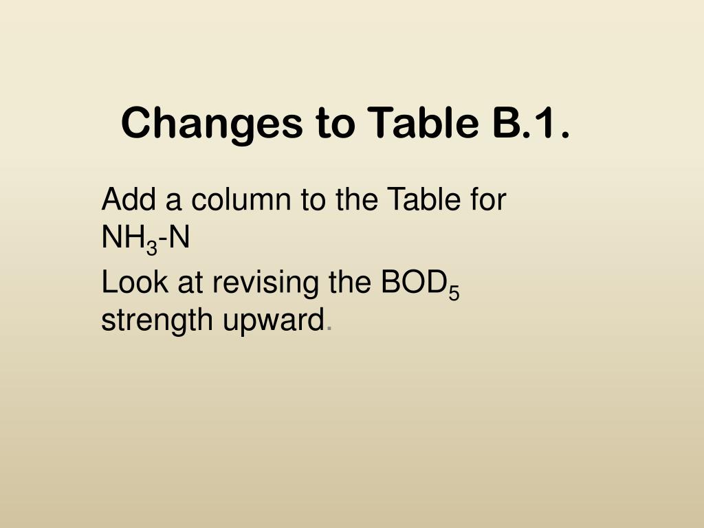 Changes to Table B.1. Add a column to the Table for NH3-N Look at revising the BOD5 strength upward.