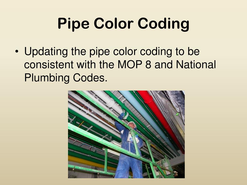 Pipe Color Coding • Updating the pipe color coding to be consistent with the MOP 8 and National Plumbing Codes.
