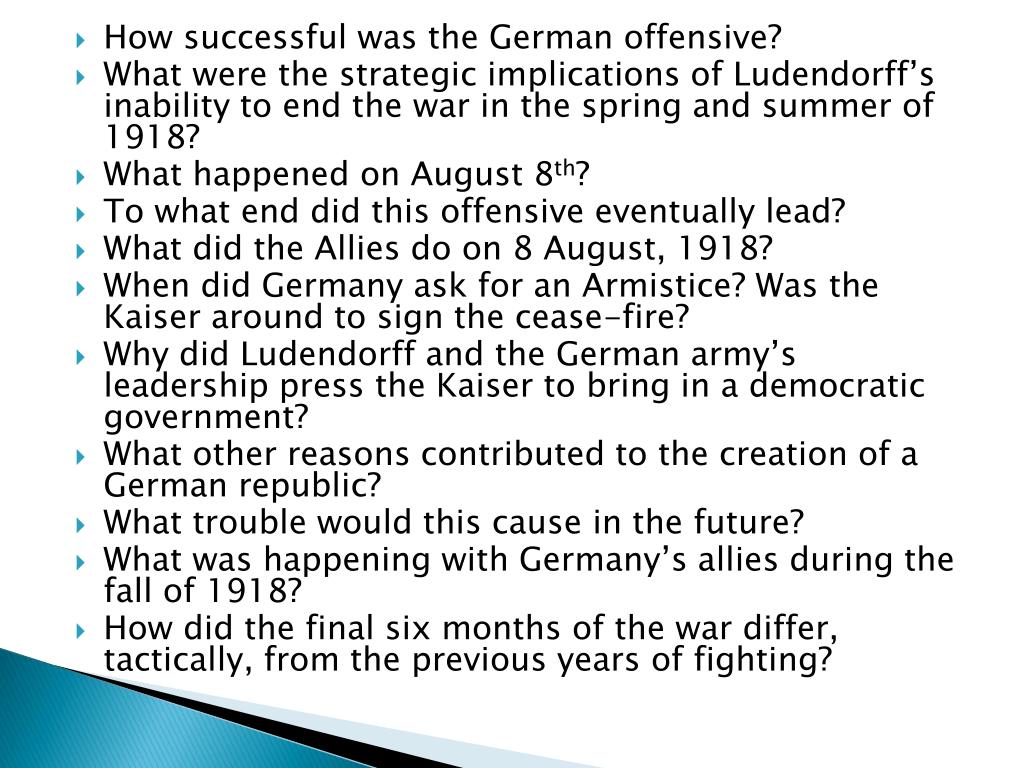 How successful was the German offensive? • What were the strategic implications of Ludendorff’s inability to end the war in the spring and summer of 1918? • What happened on August 8th? • To what end did this offensive eventually lead? • What did the Allies do on 8 August, 1918? • When did Germany ask for an Armistice? Was the Kaiser around to sign the cease-fire? • Why did Ludendorff and the German army’s leadership press the Kaiser to bring in a democratic government? • What other reasons contributed to the creation of a German republic? • What trouble would this cause in the future? • What was happening with Germany’s allies during the fall of 1918? • How did the final six months of the war differ, tactically, from the previous years of fighting?