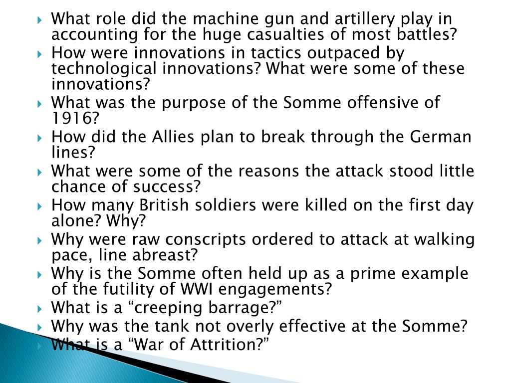 What role did the machine gun and artillery play in accounting for the huge casualties of most battles? • How were innovations in tactics outpaced by technological innovations? What were some of these innovations? • What was the purpose of the Somme offensive of 1916? • How did the Allies plan to break through the German lines? • What were some of the reasons the attack stood little chance of success? • How many British soldiers were killed on the first day alone? Why? • Why were raw conscripts ordered to attack at walking pace, line abreast? • Why is the Somme often held up as a prime example of the futility of WWI engagements? • What is a “creeping barrage?” • Why was the tank not overly effective at the Somme? • What is a “War of Attrition?”