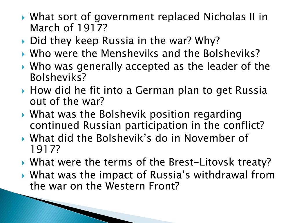 What sort of government replaced Nicholas II in March of 1917? • Did they keep Russia in the war? Why? • Who were the Mensheviks and the Bolsheviks? • Who was generally accepted as the leader of the Bolsheviks? • How did he fit into a German plan to get Russia out of the war? • What was the Bolshevik position regarding continued Russian participation in the conflict? • What did the Bolshevik’s do in November of 1917? • What were the terms of the Brest-Litovsk treaty? • What was the impact of Russia’s withdrawal from the war on the Western Front?