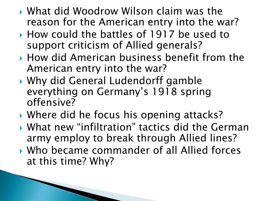 What did Woodrow Wilson claim was the reason for the American entry into the war? • How could the battles of 1917 be used to support criticism of Allied generals? • How did American business benefit from the American entry into the war? • Why did General Ludendorff gamble everything on Germany’s 1918 spring offensive? • Where did he focus his opening attacks? • What new “infiltration” tactics did the German army employ to break through Allied lines? • Who became commander of all Allied forces at this time? Why?