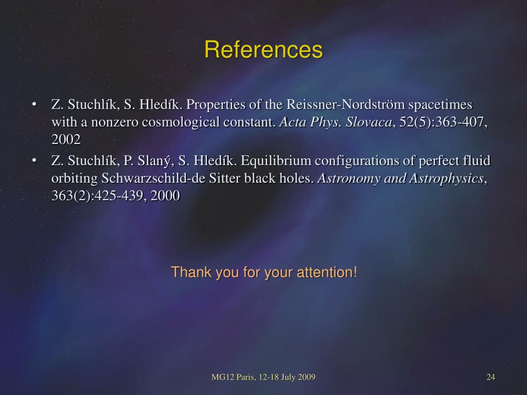 References • Z. Stuchlík, S. Hledík. PropertiesoftheReissner-Nordströmspacetimeswith a nonzero cosmological constant. Acta Phys. Slovaca, 52(5):363-407, 2002 • Z. Stuchlík, P. Slaný, S. Hledík. Equilibrium configurations of perfect fluid orbiting Schwarzschild-de Sitter black holes. Astronomy and Astrophysics, 363(2):425-439, 2000 • Thank you for your attention! MG12 Paris, 12-18 July 2009