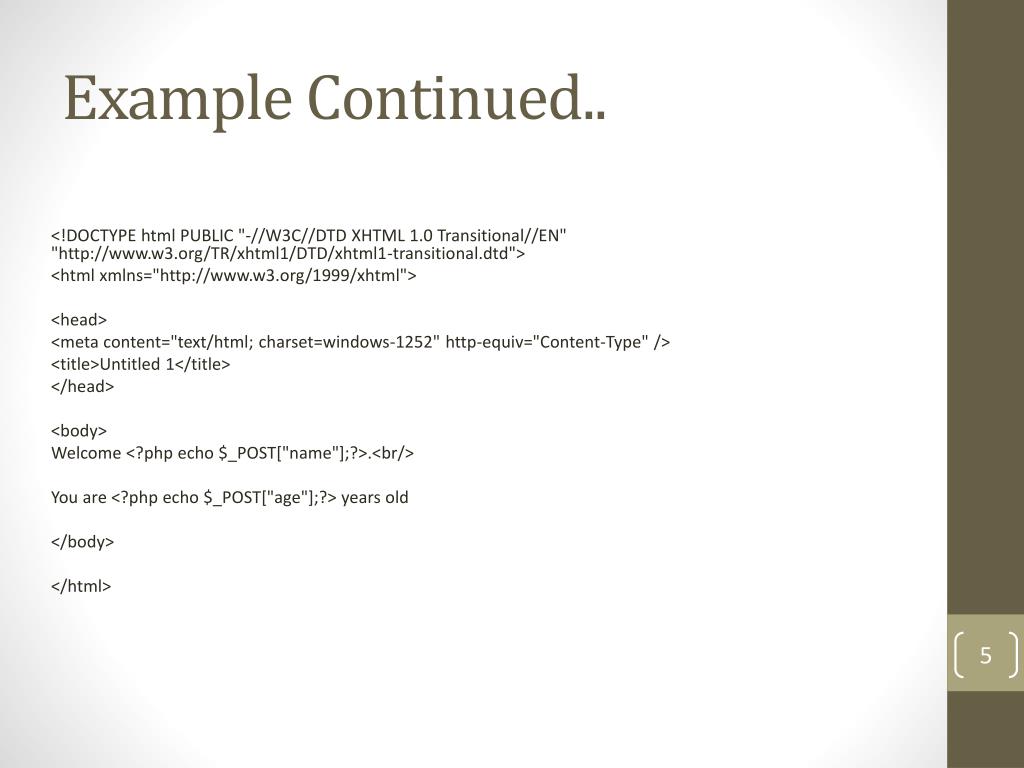 Example Continued.. <!DOCTYPE html PUBLIC "-//W3C//DTD XHTML 1.0 Transitional//EN" "http://www.w3.org/TR/xhtml1/DTD/xhtml1-transitional.dtd"> <html xmlns="http://www.w3.org/1999/xhtml"> <head> <meta content="text/html; charset=windows-1252" http-equiv="Content-Type" /> <title>Untitled 1</title> </head> <body> Welcome <?php echo $_POST["name"];?>.<br/> You are <?php echo $_POST["age"];?> years old </body> </html>