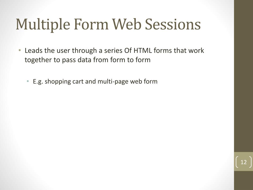 Multiple Form Web Sessions • Leads the user through a series Of HTML forms that work together to pass data from form to form • E.g. shopping cart and multi-page web form