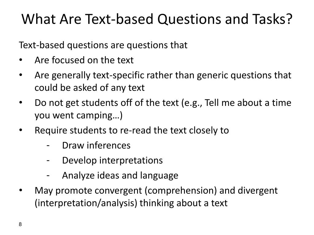 What Are Text-based Questions and Tasks? Text-based questions are questions that • Are focused on the text • Are generally text-specific rather than generic questions that could be asked of any text • Do not get students off of the text (e.g., Tell me about a time you went camping…) • Require students to re-read the text closely to • Draw inferences • Develop interpretations • Analyze ideas and language • May promote convergent (comprehension) and divergent (interpretation/analysis) thinking about a text