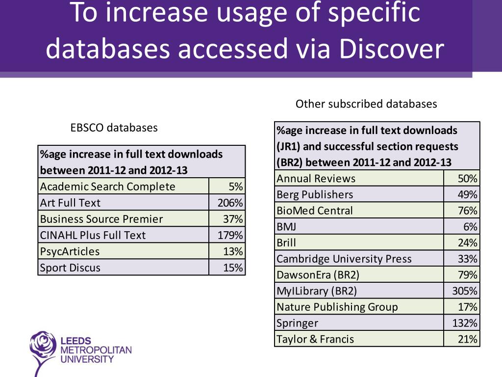To increase usage of specific databases accessed via Discover Other subscribed databases EBSCO databases