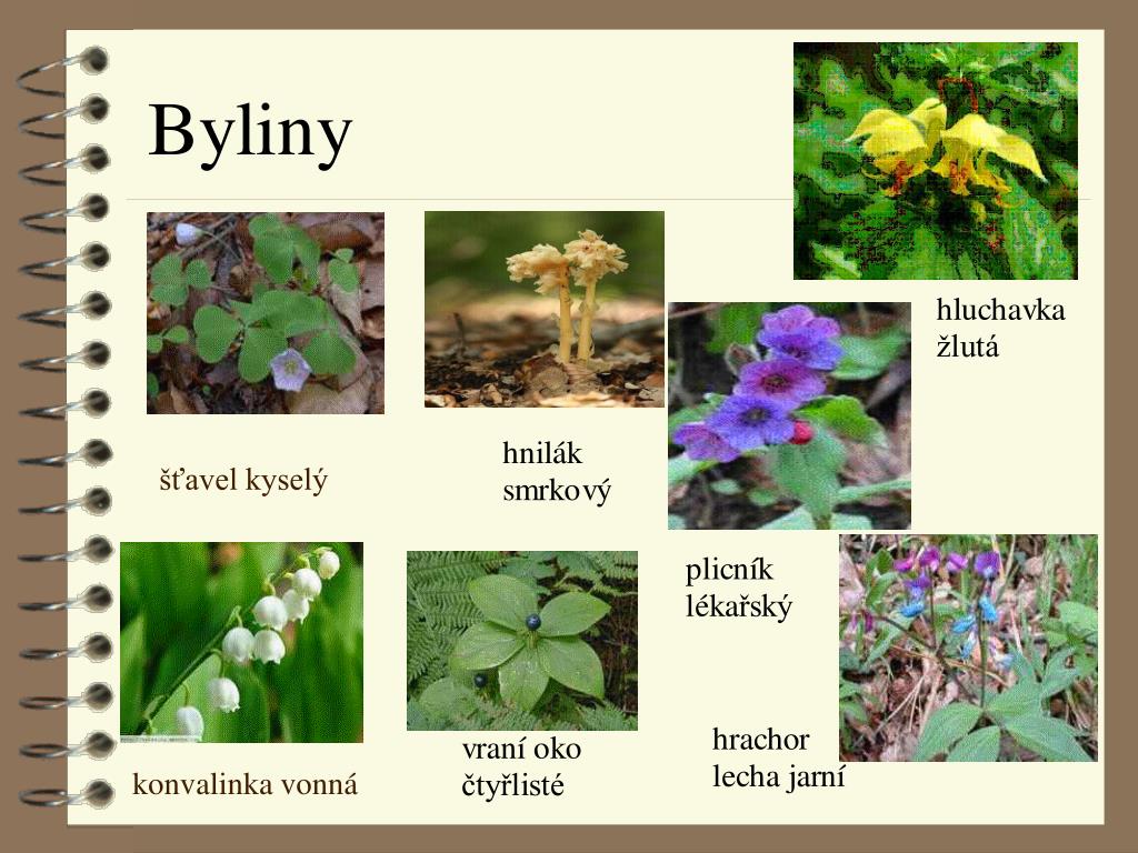 Byliny listnatých a smíšených lesů konvalinka vonná,jaterník,hrachor jarní,sasanka hajní,hluchavka žlutá,mařinka,česnek,bledule jarní,sněženka podsněžník