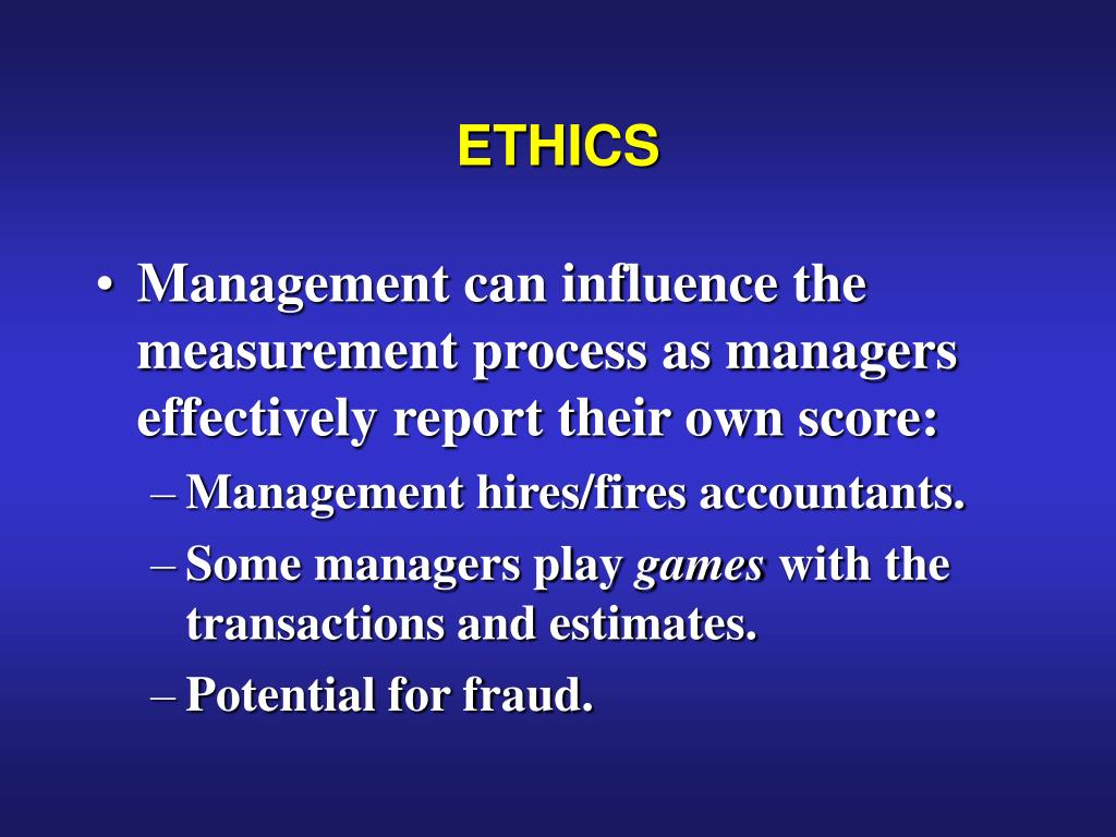 ETHICS • Management can influence the measurement process as managers effectively report their own score: • Management hires/fires accountants. • Some managers play games with the transactions and estimates. • Potential for fraud.