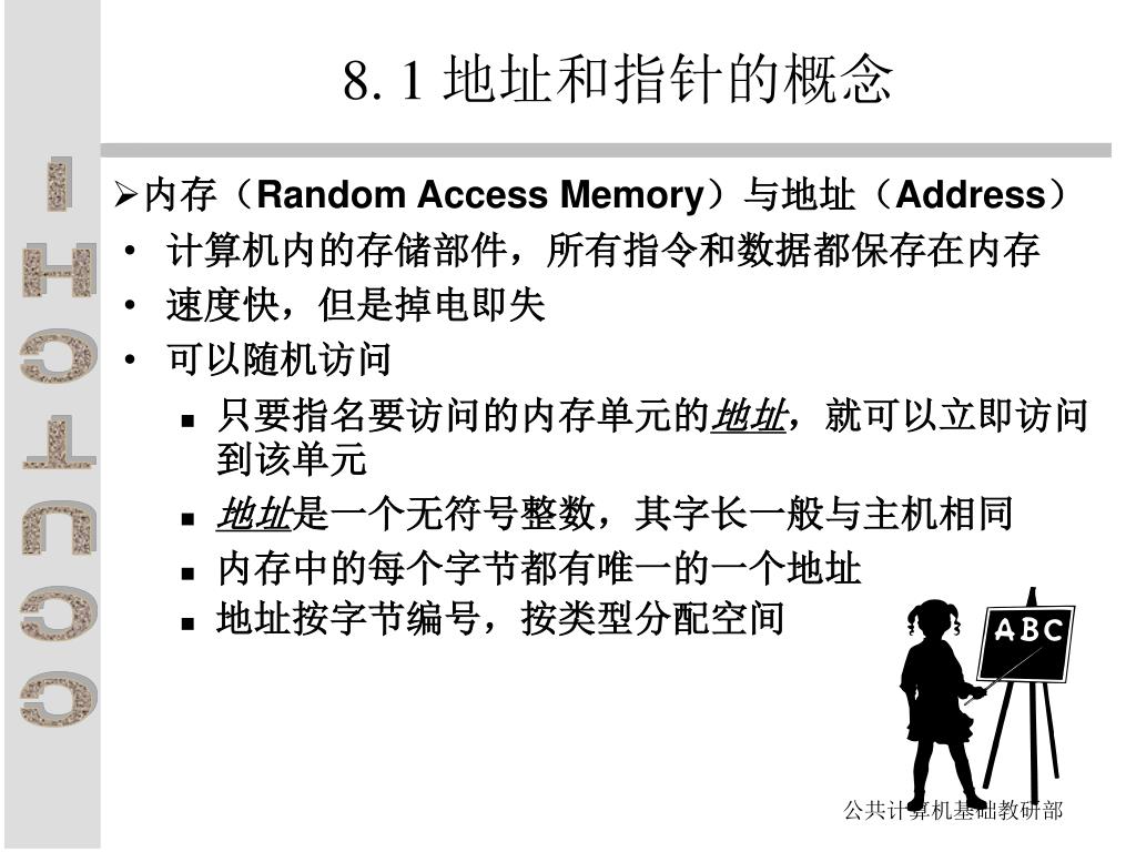 内存(Random Access Memory)与地址(Address) 8. 1 地址和指针的概念 • 计算机内的存储部件,所有指令和数据都保存在内存 • 速度快,但是掉电即失 • 可以随机访问 • 只要指名要访问的内存单元的地址,就可以立即访问到该单元 • 地址是一个无符号整数,其字长一般与主机相同 • 内存中的每个字节都有唯一的一个地址 • 地址按字节编号,按类型分配空间