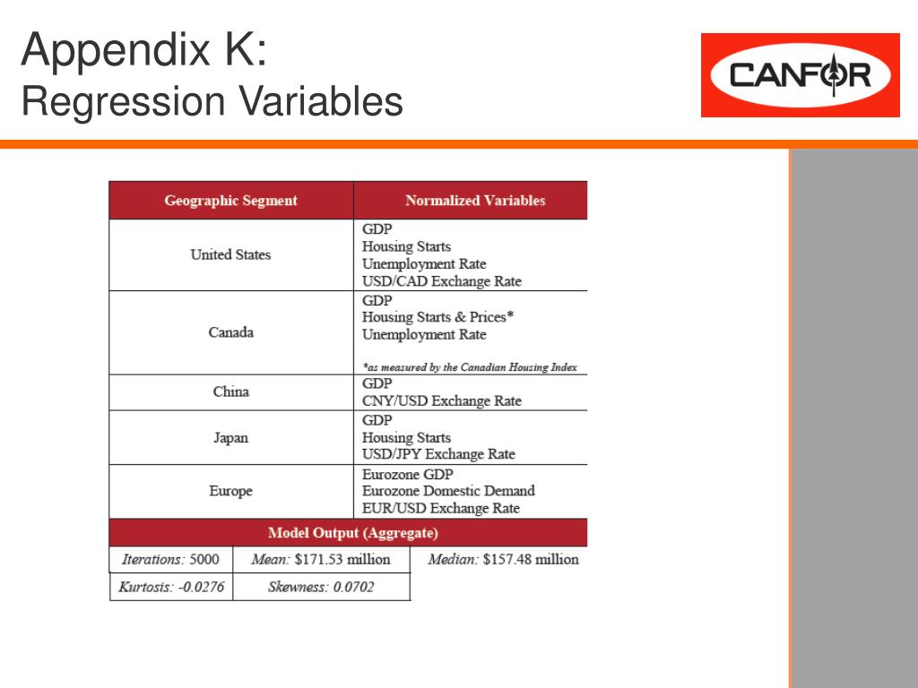 EBITDA Regression: Variables • Method: Regress regional EBITDA over the following macroeconomic variables in each region. Overview Financial Analysis EBITDA Mean: $171 Million Valuation Risks