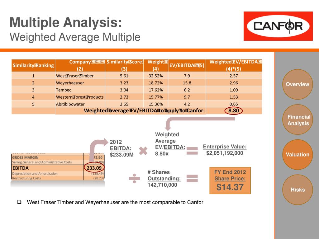 Multiple Analysis: Weighted Average Multiple Overview Financial Analysis Weighted Average EV/EBITDA: 8.80x 2012 EBITDA: $233.09M Enterprise Value: $2,051,192,000 Valuation # Shares Outstanding: 142,710,000 FY End 2012 Share Price: $14.37 Risks • West Fraser Timber and Weyerhaeuser are the most comparable to Canfor