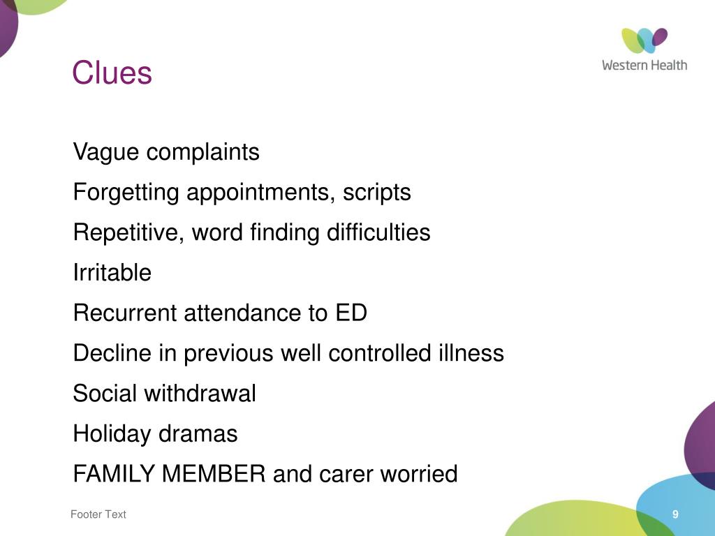Clues Vague complaints Forgetting appointments, scripts Repetitive, word finding difficulties Irritable Recurrent attendance to ED Decline in previous well controlled illness Social withdrawal Holiday dramas FAMILY MEMBER and carer worried