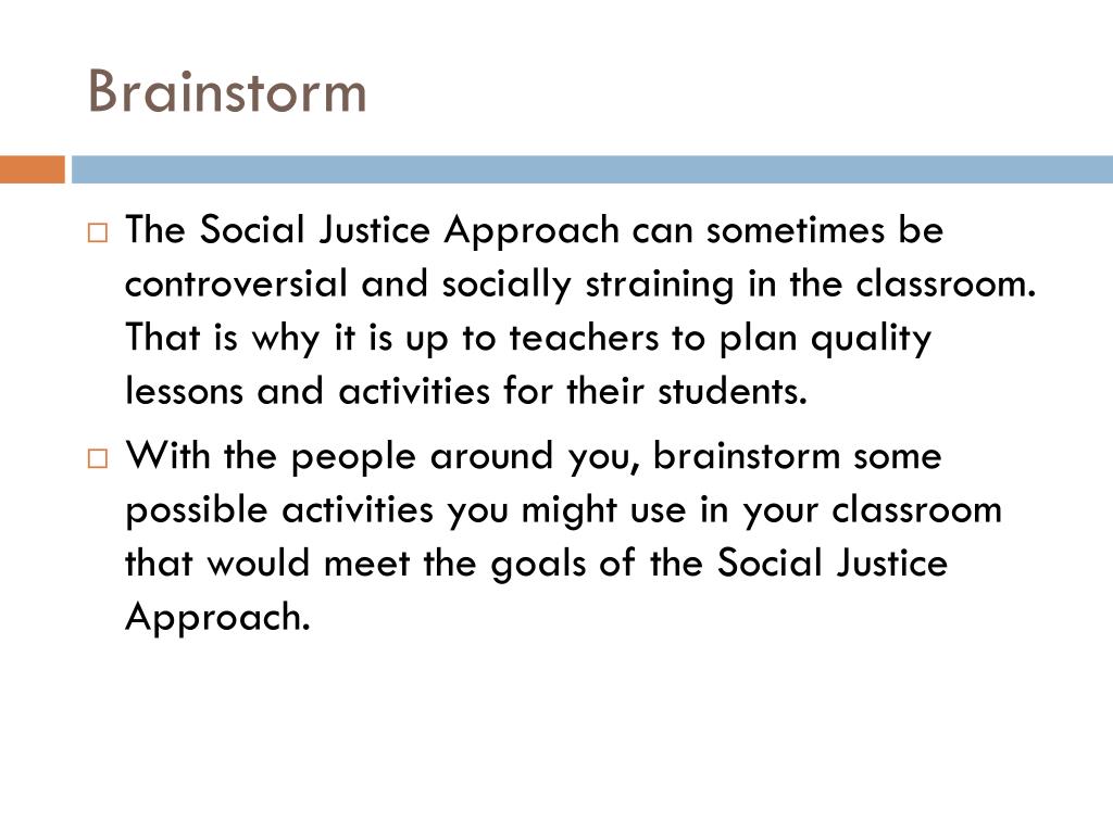 Brainstorm • The Social Justice Approach can sometimes be controversial and socially straining in the classroom. That is why it is up to teachers to plan quality lessons and activities for their students. • With the people around you, brainstorm some possible activities you might use in your classroom that would meet the goals of the Social Justice Approach.