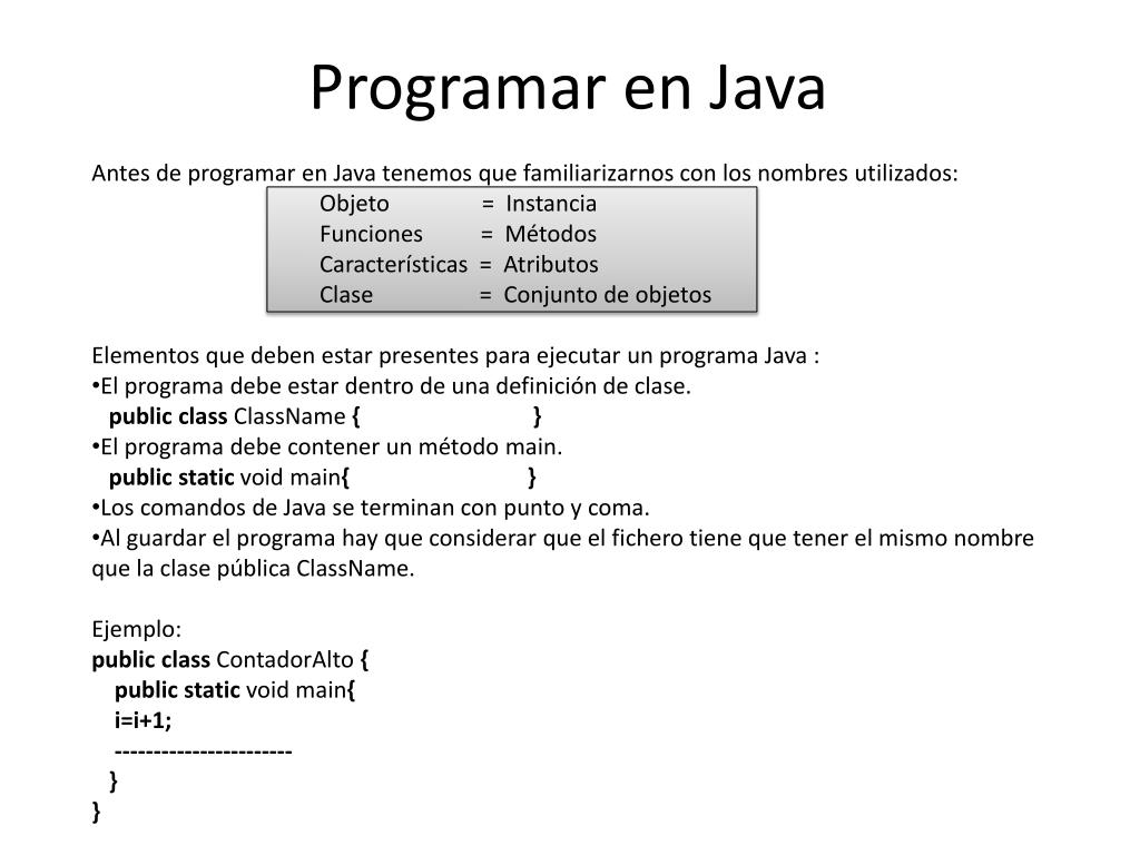 Programar en Java • Antes de programar en Java tenemos que familiarizarnos con los nombres utilizados: • Objeto = Instancia • Funciones = Métodos • Características = Atributos • Clase = Conjunto de objetos • Elementos que deben estar presentes para ejecutar un programa Java : • El programa debe estar dentro de una definición de clase. • publicclassClassName{ } • El programa debe contener un método main. • publicstaticvoidmain{ } • Los comandos de Java se terminan con punto y coma. • Al guardar el programa hay que considerar que el fichero tiene que tener el mismo nombre que la clase pública ClassName. • Ejemplo: • publicclassContadorAlto{ • publicstaticvoidmain{ • i=i+1; • ----------------------- • } • }