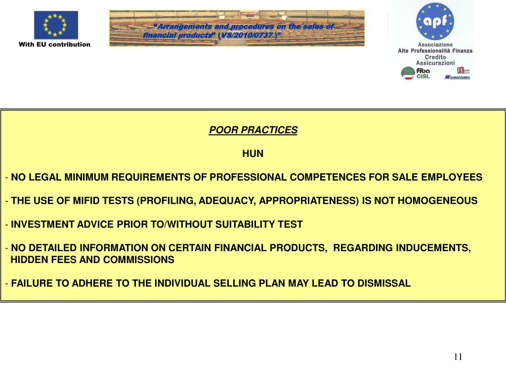 POOR PRACTICES • HUN • NO LEGAL MINIMUM REQUIREMENTS OF PROFESSIONAL COMPETENCES FOR SALE EMPLOYEES • THE USE OF MIFID TESTS (PROFILING, ADEQUACY, APPROPRIATENESS) IS NOT HOMOGENEOUS • INVESTMENT ADVICE PRIOR TO/WITHOUT SUITABILITY TEST • NO DETAILED INFORMATION ON CERTAIN FINANCIAL PRODUCTS, REGARDING INDUCEMENTS, • HIDDEN FEES AND COMMISSIONS • FAILURE TO ADHERE TO THE INDIVIDUAL SELLING PLAN MAY LEAD TO DISMISSAL