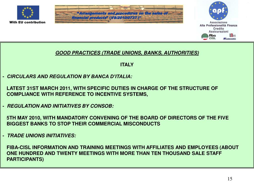 GOOD PRACTICES (TRADE UNIONS, BANKS, AUTHORITIES) • ITALY • - CIRCULARS AND REGULATION BY BANCA D’ITALIA: • LATEST 31ST MARCH 2011, WITH SPECIFIC DUTIES IN CHARGE OF THE STRUCTURE OF • COMPLIANCE WITH REFERENCE TO INCENTIVE SYSTEMS, • - REGULATION AND INITIATIVES BY CONSOB: • 5TH MAY 2010, WITH MANDATORY CONVENING OF THE BOARD OF DIRECTORS OF THE FIVE • BIGGEST BANKS TO STOP THEIR COMMERCIAL MISCONDUCTS • - TRADE UNIONS INITIATIVES: • FIBA-CISL INFORMATION AND TRAINING MEETINGS WITH AFFILIATES AND EMPLOYEES (ABOUT • ONE HUNDRED AND TWENTY MEETINGS WITH MORE THAN TEN THOUSAND SALE STAFF • PARTICIPANTS)