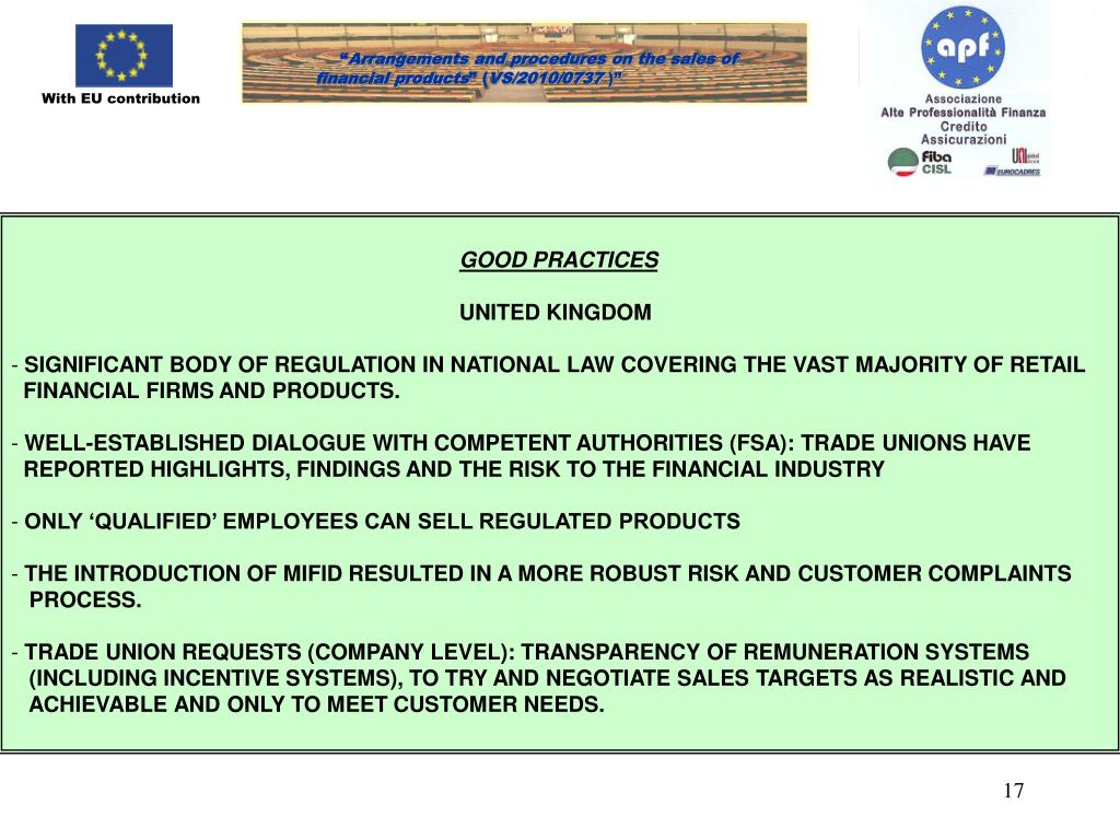 GOOD PRACTICES • UNITED KINGDOM • SIGNIFICANT BODY OF REGULATION IN NATIONAL LAW COVERING THE VAST MAJORITY OF RETAIL • FINANCIAL FIRMS AND PRODUCTS. • WELL-ESTABLISHED DIALOGUE WITH COMPETENT AUTHORITIES (FSA): TRADE UNIONS HAVE • REPORTED HIGHLIGHTS, FINDINGS AND THE RISK TO THE FINANCIAL INDUSTRY • ONLY ‘QUALIFIED’ EMPLOYEES CAN SELL REGULATED PRODUCTS • THE INTRODUCTION OF MIFID RESULTED IN A MORE ROBUST RISK AND CUSTOMER COMPLAINTS • PROCESS. • TRADE UNION REQUESTS (COMPANY LEVEL): TRANSPARENCY OF REMUNERATION SYSTEMS • (INCLUDING INCENTIVE SYSTEMS), TO TRY AND NEGOTIATE SALES TARGETS AS REALISTIC AND • ACHIEVABLE AND ONLY TO MEET CUSTOMER NEEDS.
