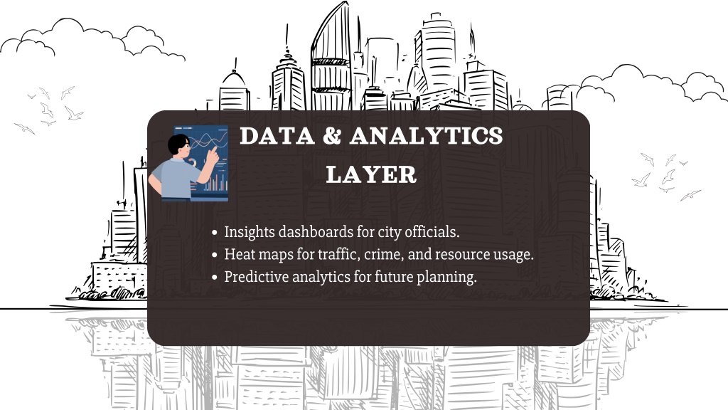 DATA & ANALYTICS LAYER Insights dashboards for city officials. Heat maps for traffic, crime, and resource usage. Predictive analytics for future planning.