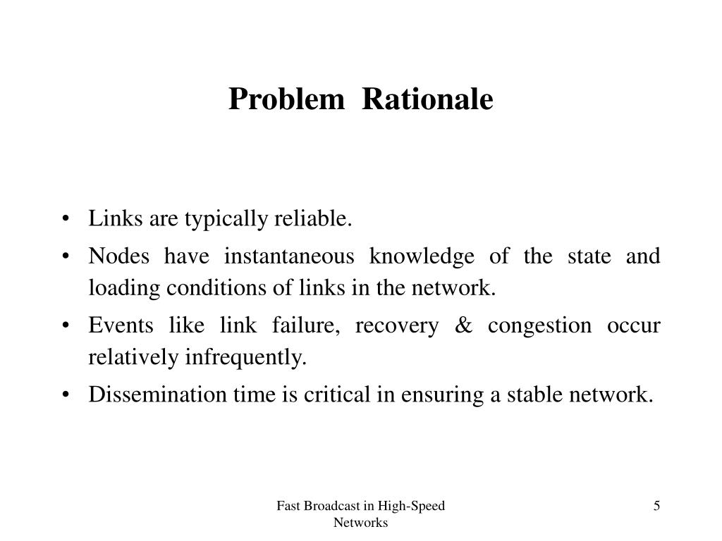 Problem Rationale • Links are typically reliable. • Nodes have instantaneous knowledge of the state and loading conditions of links in the network. • Events like link failure, recovery & congestion occur relatively infrequently. • Dissemination time is critical in ensuring a stable network. Fast Broadcast in High-Speed Networks