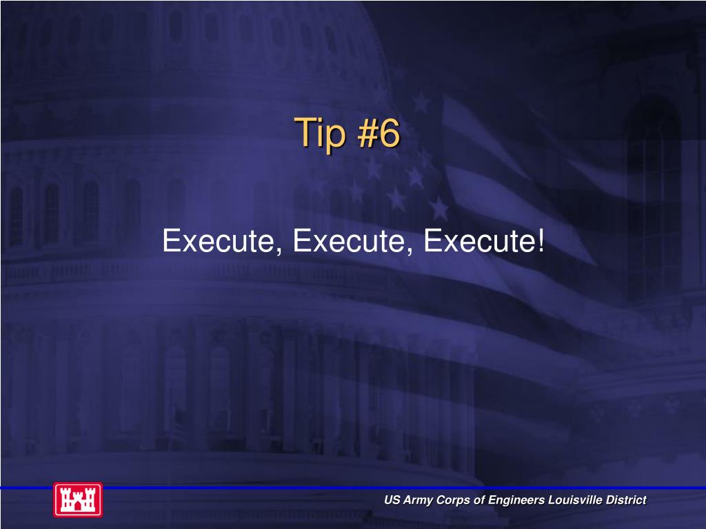 What can you do? • Visit potential clients • Get to know our clients’ business • Ask what “keeps them up at night” • Study the money • Don’t forget your subcontractors US Army Corps of Engineers, Louisville District