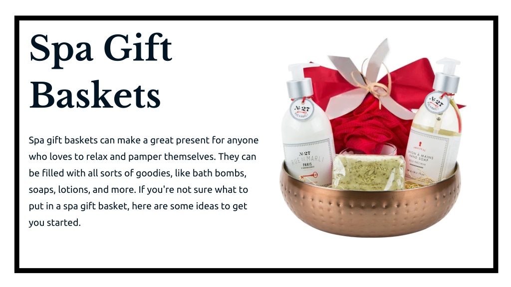 Spa Gift Baskets Spa gift baskets can make a great present for anyone who loves to relax and pamper themselves. They can be filled with all sorts of goodies, like bath bombs, soaps, lotions, and more. If you're not sure what to put in a spa gift basket, here are some ideas to get you started.