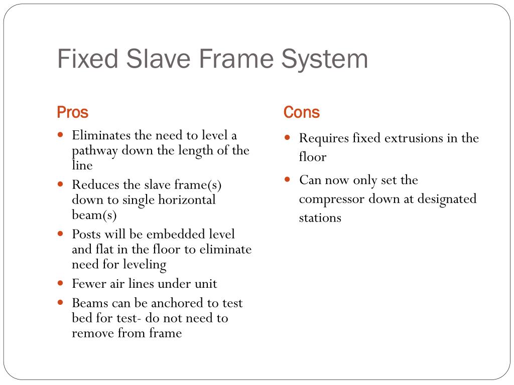 Fixed Slave Frame System Pros Cons Eliminates the need to level a pathway down the length of the line Reduces the slave frame(s) down to single horizontal beam(s) Posts will be embedded level and flat in the floor to eliminate need for leveling Fewer air lines under unit Beams can be anchored to test bed for test- do not need to remove from frame Requires fixed extrusions in the floor Can now only set the compressor down at designated stations