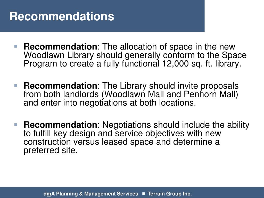 Recommendations • Recommendation: The allocation of space in the new Woodlawn Library should generally conform to the Space Program to create a fully functional 12,000 sq. ft. library. • Recommendation: The Library should invite proposals from both landlords (Woodlawn Mall and Penhorn Mall) and enter into negotiations at both locations. • Recommendation: Negotiations should include the ability to fulfill key design and service objectives with new construction versus leased space and determine a preferred site. dmA Planning & Management Services ■ Terrain Group Inc.