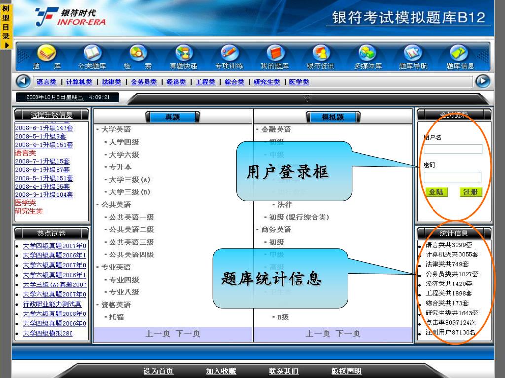 题库概述 银符考试模拟题库B12是北京银符信息技术有限公司研发的集资源、功能和技巧交流为一体的新型在线考试模拟平台。 题库涵盖了语言、计算机、研究生、公务员、经济、法 律、工程、医学等九大类、近三百种国内热门考试,可满足不同类型用户的不同考试需求。 题库不受时间和空间的限制,可以在线答题、在线评分、提供答案解析,操作简单方便。 除主题库外,银符考试模拟题库B12还特有资源共享、考试技巧交流等模块,助考生了解最新考试动向。