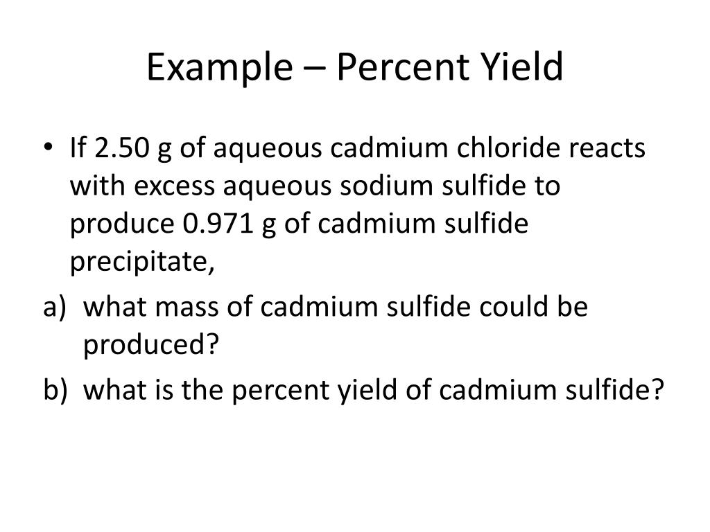 Example – Percent Yield • If 2.50 g of aqueous cadmium chloride reacts with excess aqueous sodium sulfide to produce 0.971 g of cadmium sulfide precipitate, • what mass of cadmium sulfide could be produced? • what is the percent yield of cadmium sulfide?