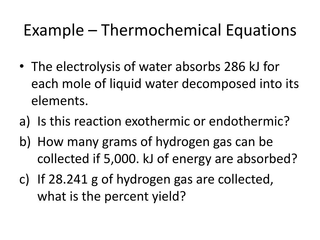 Example – Thermochemical Equations • The electrolysis of water absorbs 286 kJ for each mole of liquid water decomposed into its elements. • Is this reaction exothermic or endothermic? • How many grams of hydrogen gas can be collected if 5,000. kJ of energy are absorbed? • If 28.241 g of hydrogen gas are collected, what is the percent yield?