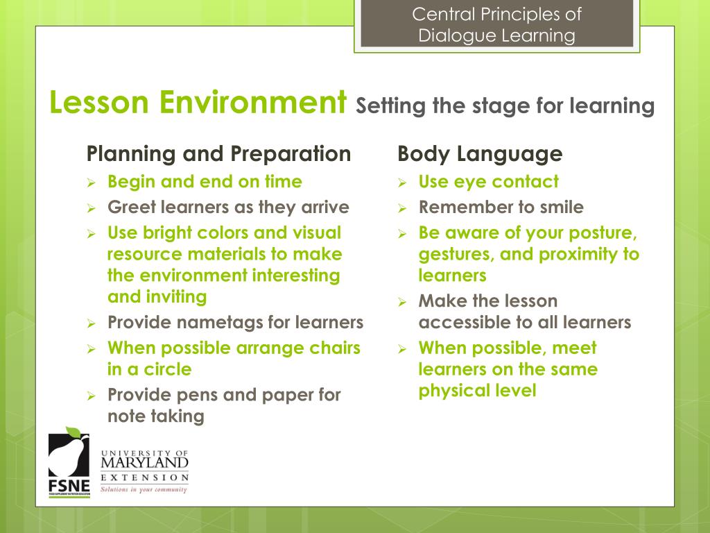 Central Principles of Dialogue Learning Lesson Environment Setting the stage for learning Planning and Preparation • Begin and end on time • Greet learners as they arrive • Use bright colors and visual resource materials to make the environment interesting and inviting • Provide nametags for learners • When possible arrange chairs in a circle • Provide pens and paper for note taking Body Language • Use eye contact • Remember to smile • Be aware of your posture, gestures, and proximity to learners • Make the lesson accessible to all learners • When possible, meet learners on the same physical level