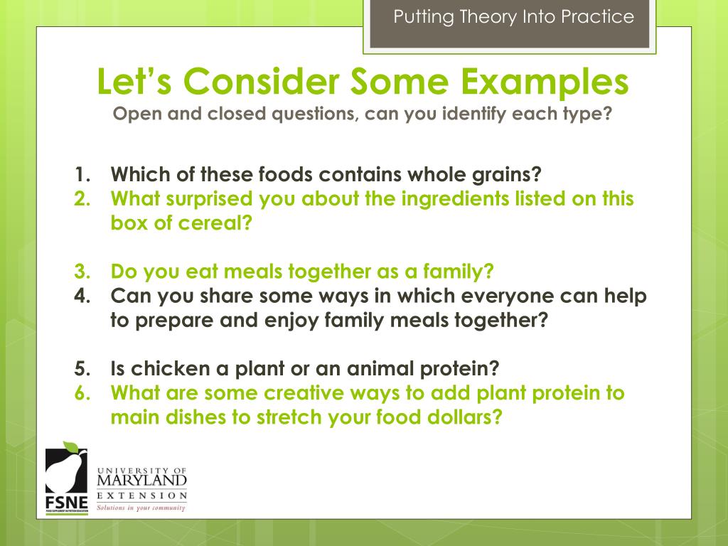 Putting Theory Into Practice Let’s Consider Some ExamplesOpen and closed questions, can you identify each type? Which of these foods contains whole grains? What surprised you about the ingredients listed on this box of cereal? Do you eat meals together as a family? Can you share some ways in which everyone can help to prepare and enjoy family meals together? Is chicken a plant or an animal protein? What are some creative ways to add plant protein to main dishes to stretch your food dollars?